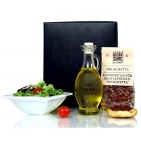 Artikel-Nr: A276K00805Traditionelles Set bestehend aus einer sandgestrahlten Schmuckflasche Egizia 0,25 l., gefüllt mit feinstem, nativen Olivenöl und in Kombination mit einer fruchtigen Mischung Bruschetta 100 g. für den typisch italienischen Brotaufstrich Bruschetta. Verpackt in einer ansprechenden Präsentkartonage mit passendem Sizzle Pak. Werbemöglichkeit durch Sandstrahlung Ihres z.B. Logos auf dem Glaskörper.