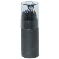 Zwölf kleine, schwarze Farbstifte in einer Rundbox mit transparentem Kunststoffspitzer. Achtung! Kein Spielzeug!