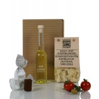Artikel-Nr: A276K00972Präsentset bestehend aus einer köstlichen Gewürzmischung Aglio Olio, in Kombination mit einer schönen Schmuckflasche Opera, befüllt mit hochwertigem Olivenöl extra nativ. Abgerundet wird dieses Set durch zwei leckere Tartufo nero al torrone, welche für den süssen Feinschmeckergaumen in nachhaltiger Erinnerung bleiben. Werbemöglichkeit durch Veredelung der Schmuckflasche mit Ihrem Logo durch Sandstrahlung. Inhalt: Schmuckflasche Opera 0,1 l. - sandgestrahlt / Füllung Olivenöl nativ extra / 100 g. Aglio Olio Würzmischung / 2 x Tortufo nero al torrone a 18 g / Präsentkartonage mit Sizzle Pak.