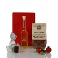 Artikel-Nr: A276K00970Mit diesem mediterranen Präsent bringen Sie die klassische Komposition für den bekannten Brotaufstrich Bruschetta direkt zu Ihren Kunden und Geschäftspartnern. Eine köstliche Kombination aus hochwertigem Olivenöl nativ extra, abgefüllt in einer auf Wunsch mit z.B. Ihrem Logo durch Sandstrahlung veredelten Flasche Opera, passend dazu die feine Gewürzmischung Bruschetta, versprechen ein nachhaltiges Geschmackserlebnis. Der passende Nachtisch findet sich in Form edler Tartufo nero al torrone, feinste Schokoladentrüffel mit Torrone, eine harmonische Kombination von Honig, Mandeln, Haselnüssen und Schokolade. Inhalt: Schmuckflasche Opera 0,1 l. - sandgestrahlt / Füllung Olivenöl nativ extra / 100 g. Gewürzmischung Bruschetta / 2 x Tortufo nero al torrone / Präsentkartonage mit Sizzle Pak.