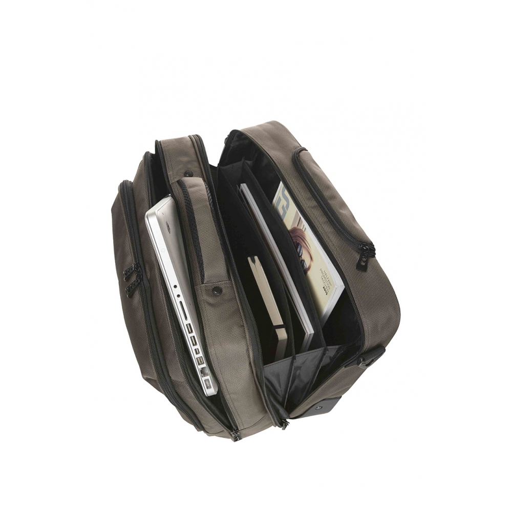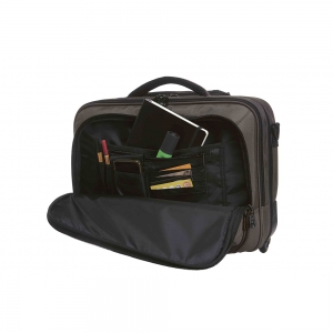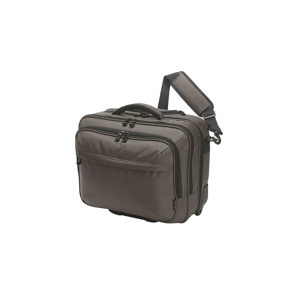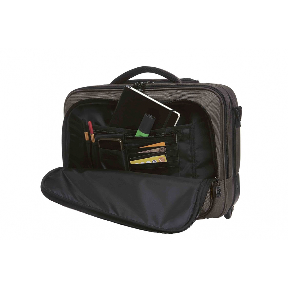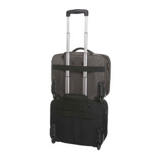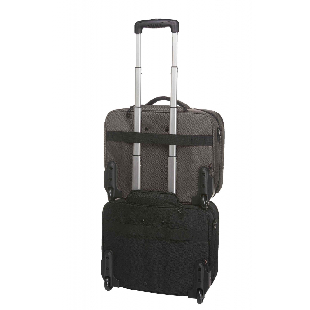 Artikel-Nr: HLF1812215-220Aufwändig gepolsterter Laptop-Trolley; Reißverschlussfach für Notebook; Dokumenten-Reißverschlussfach mit Separation; Reißverschluss-Vortasche mit Organizer-Elementen; Reißverschluss-Vortasche; Handgriff; abnehmbarer, zweiseitig längenverstellbarer Schultergurt mit genähtem Schulterpolster; rückseitige Befestigungsschlaufe für Gepäck-Trolley; Teleskopgriff
