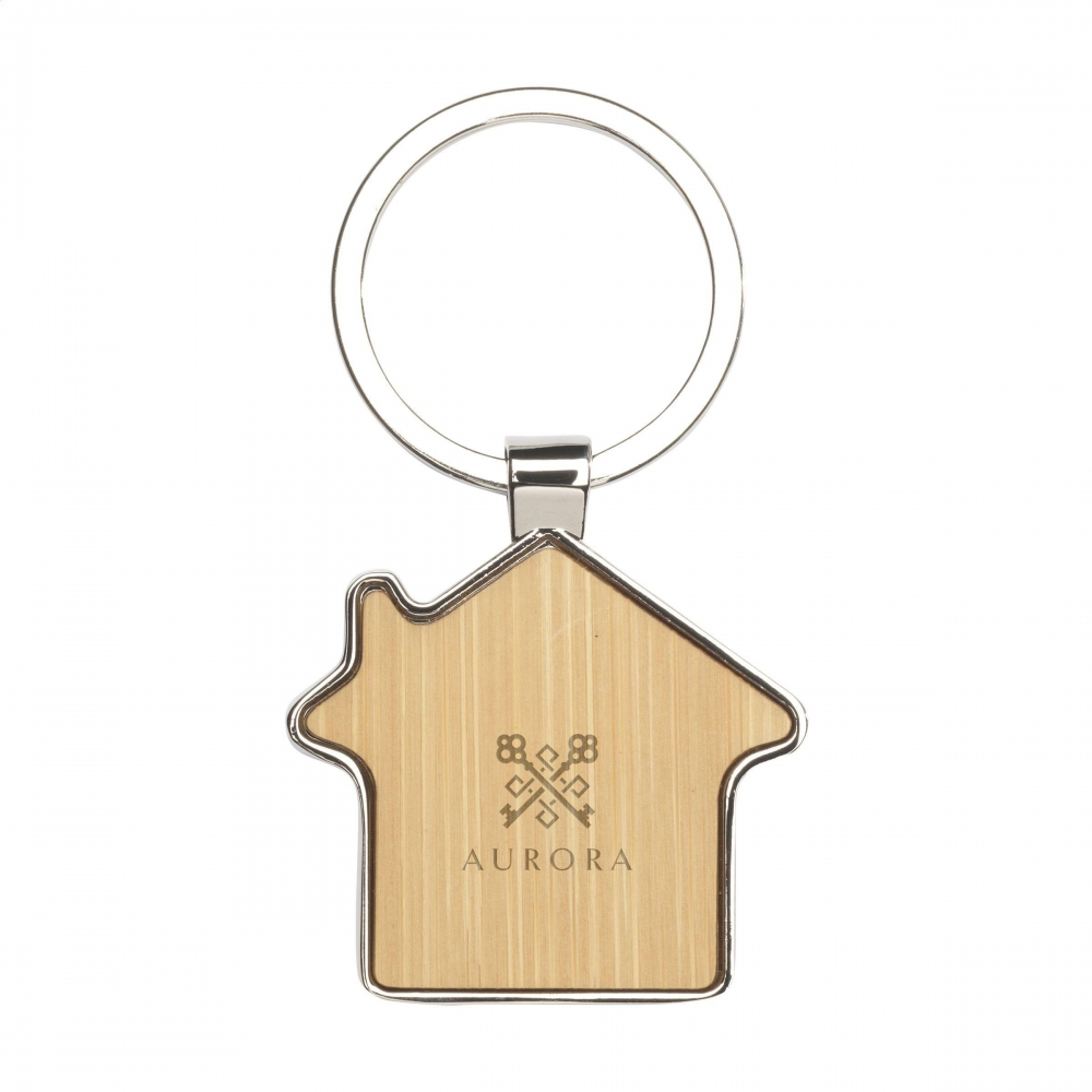 Artikel-Nr: CLP261364-823Schlüsselanhänger in Form eines Hauses. Mit hochglänzendem Metallgehäuse und Inlay aus Bambus.