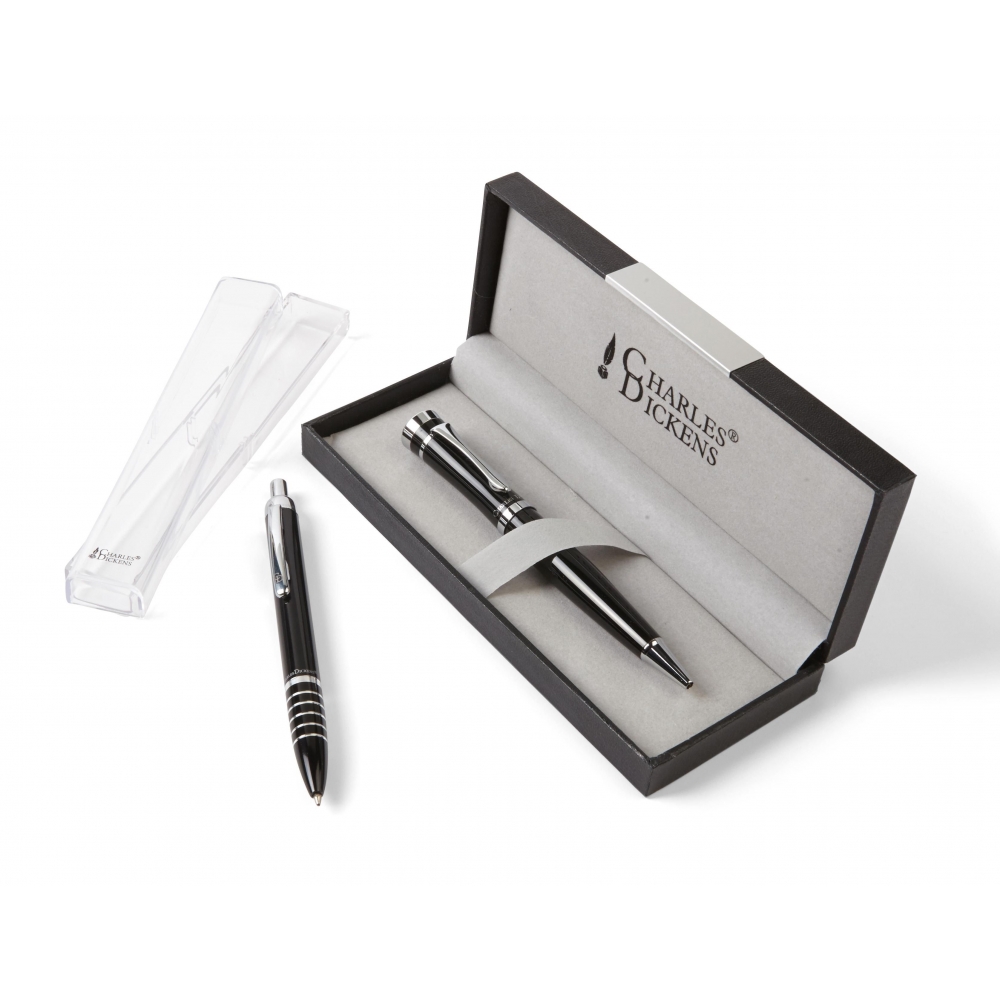 Artikel-Nr: GIV1085001Charles Dickens Kugelschreiber, mit schwarzer Mine und Geschenk-Etui mit Metallplakette.