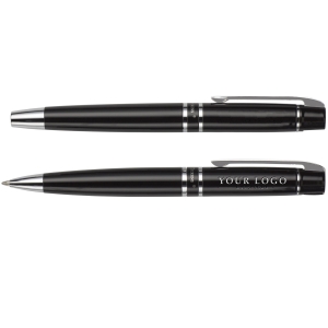 Artikel-Nr: GIV1058001Charles Dickens Schreibset 'Leeds' aus Metall, bestehend aus Dreh-Kugelschreiber und Rollerball, Zierringen aus Metall, verpackt in einem Geschenk-Etui aus PU.
