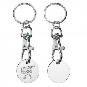Artikel-Nr: ELT04128023-00000Immer am Haken. Nützlicher Einkaufswagenchip aus Metall mit Karabinerhaken und Schlüsselring. Kann mittels Lasergravur individuell gestaltet werden. Aufgrund der Materialbeschaffenheit erscheint die Gravur auf dem Chip rötlich bzw. rosa.