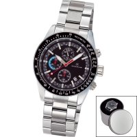 Artikel-Nr: 57329315CH-SWChronograph mit Metallgehäuse glänzend mit hochwertiger IP-Beschichtung, wasserdicht 3 bar, robustes PU-Sportarmband mit Edelstahl-Dornschließe, gehärtetes Mineralglas, Zeiger und Stundenindex fluoreszierend, Markenuhrwerk JS15 von Miyota (by CITIZEN) mit Datumsfunktion, 5 Jahre Garantie, Metalldose inkl.