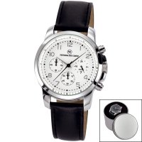Artikel-Nr: 57326450CH-SWEdelstahl-Chronograph poliert mit Schraubboden, Kronenschutz, wasserdicht 5 bar nach DIN 8310, Echtlederband aus feinstem Rindsleder mit Edelstahl-Dornschließe, gehärtetes Mineralglas, Markenuhrwerk mit 24-Stunden-Anzeige, 5 Jahre Garantie, Metalldose inkl.
