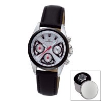 Artikel-Nr: 57321675CH-SWChronograph mit Metallgehäuse glänzend mit hochwertiger IP-Beschichtung, Kronenschutz, wasserdicht 3 bar, hochwertiges Silikon-Sportarmband mit Edelstahl-Dornschließe, gehärtetes Mineralglas, aufwändig verarbeitetes Zifferblatt, Zeiger und Stundenindex fluoreszierend, Markenuhrwerk JS20 von Miyota (by CITIZEN) mit 24-Stunden-Anzeige, 5 Jahre Garantie, Metalldose inkl.