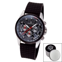 Artikel-Nr: 57321665RO-SWChronograph mit Metallgehäuse glänzend mit hochwertiger IP Beschichtung, Kronenschutz, wasserdicht 3 bar, hochwertiges Silikon-Sportarmband mit Edelstahl-Dornschließe, gehärtetes Mineralglas, aufwändig verarbeitetes Zifferblatt, Zeiger und Stundenindex fluoreszierend, Markenuhrwerk JS20 von Miyota (by CITIZEN) mit 24-Stunden Anzeige, 5 Jahre Garantie, Metalldose inkl.