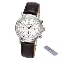 Artikel-Nr: 57329550CH-SWChronograph mit Metallgehäuse glänzend mit hochwertiger IP-Beschichtung, wasserdicht 3 bar, Echtlederband aus feinstem Rindsleder mit Edelstahl-Dornschließe, gehärtetes Mineralglas, Zeiger fluoreszierend, Markenuhrwerk mit 24-Stunden-Anzeige, 5 Jahre Garantie, Kartonverpackung inkl.