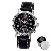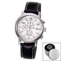 Artikel-Nr: 57329470CH-CHEdelstahl-Chronograph poliert mit Schraubboden, wasserdicht 5 bar nach DIN 8310, gepolstertes Echtlederband aus feinstem Rindsleder mit Edelstahl-Dornschließe, gehärtetes Mineralglas, Zeiger fluoreszierend, Zifferblatt geprägt, Markenuhrwerk OS10 von Miyota (by CITIZEN) mit Zentralstoppsekunde und Datumsfunktion, 5 Jahre Garantie, Metalldose inkl.