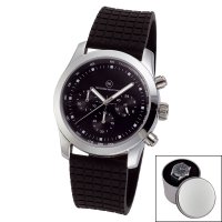 Artikel-Nr: 57322520SW-SWChronograph mit Metallgehäuse glänzend mit hochwertiger IP-Beschichtung, wasserdicht 3 bar, hochwertiges Silikon-Sportarmband mit Edelstahl-Dornschließe, gehärtetes Mineralglas, Zeiger fluoreszierend, Markenuhrwerk JS20 von Miyota (by CITIZEN) mit 24-Stunden- Anzeige, 5 Jahre Garantie, Metalldose inkl.