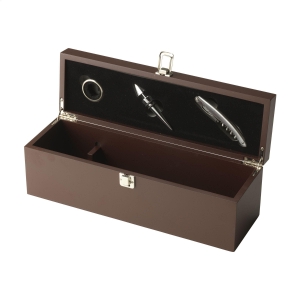 Artikel-Nr: CLP267046-010Schicke, hölzerne Weinkiste mit Tropfenfänger, Flaschenverschluss und Edelstahl-Kellnermesser. Ohne Wein geliefert