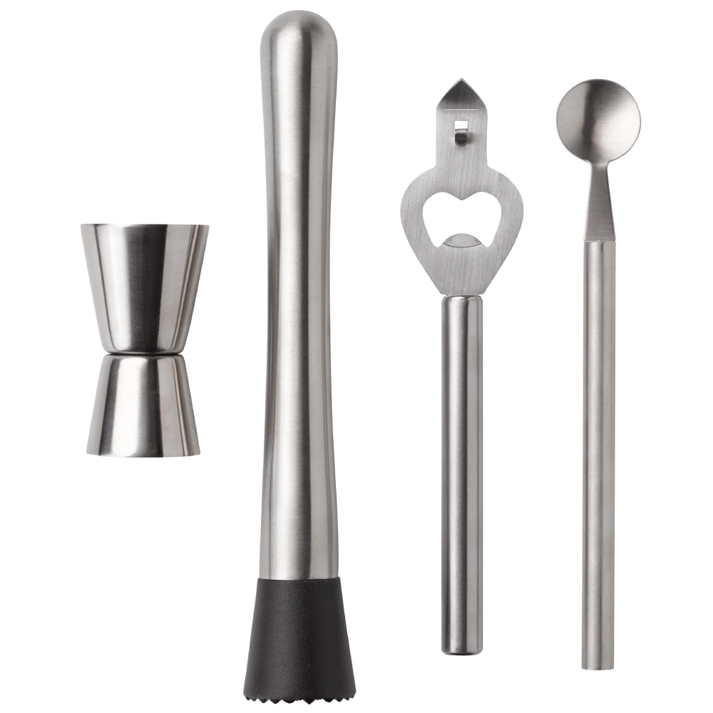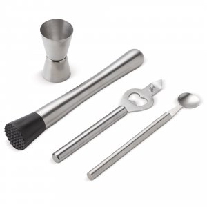 Artikel-Nr: ART94537N0005Sie können die leckersten Cocktails selbst zubereiten mit diesem modernen professionellen Cocktail-Set. Das hochwertige silberne Edelstahlset ist mit einem Stößel zum Zerkleinern der Zutaten, einem Barmaß zur Messung der richtigen Alkoholmenge, einem Flaschenöffner und einem Löffel ausgestattet. Mit Hilfe dieses Sets können Sie den perfekten Mojito oder ein anderes Getränk wie ein echter Barkeeper zubereiten.