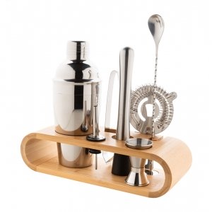 Artikel-Nr: AND8970967-teiliges Cocktail-Set aus Edelstahl im Bambushalter. Inklusive: Cocktail-Shaker (Füllmenge: 550 ml), Messbecher, Sieb, Barlöffel, Stößel, Eiszange und Ausgießer.