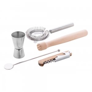 Artikel-Nr: AND8082165-teiliges Cocktail-Set im praktischen Baumwoll-Rollbeutel. Inklusive: Messbecher, Barsieb und Barlöffel aus Edelstahl, Korkenzieher mit Holzgriff und Holzstößel.