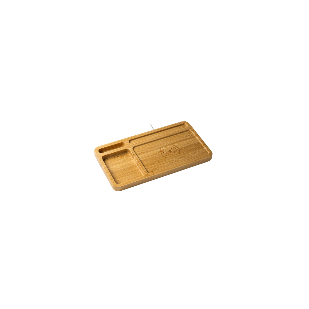 Artikel-Nr: PRM812135_20Kabelloses Ladegerät aus natürlichem Bambus, in die Organizer-Schublade integriert. Kompatibel mit Geräten mit kabelloser Ladetechnologie. 5W Ausgangsleistung. Inklusive weißem Kabel.