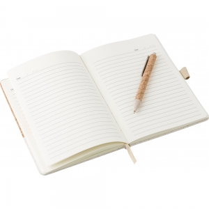 Artikel-Nr: GIV9312011Notizbuch aus Kork und Leinen sowie Kugelschreiber aus Kork und Weizenstroh in einer Pappschachtel. Das Notizbuch hat eine elastische Stiftschlaufe und 80 Blatt linierte Seiten. Schreibfarbe des Kugelschreibers ist blau.