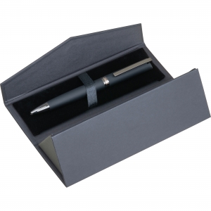 Artikel-Nr: MCM1499103Drehkugelschreiber aus Metall und gummierter Oberfläche in klassischem Design mit blau schreibender Großraummine. Geliefert wird der Kugelschreiber in einem schwarzen Etui. Ihre Werbung wird auf den Kugelschreiber graviert.