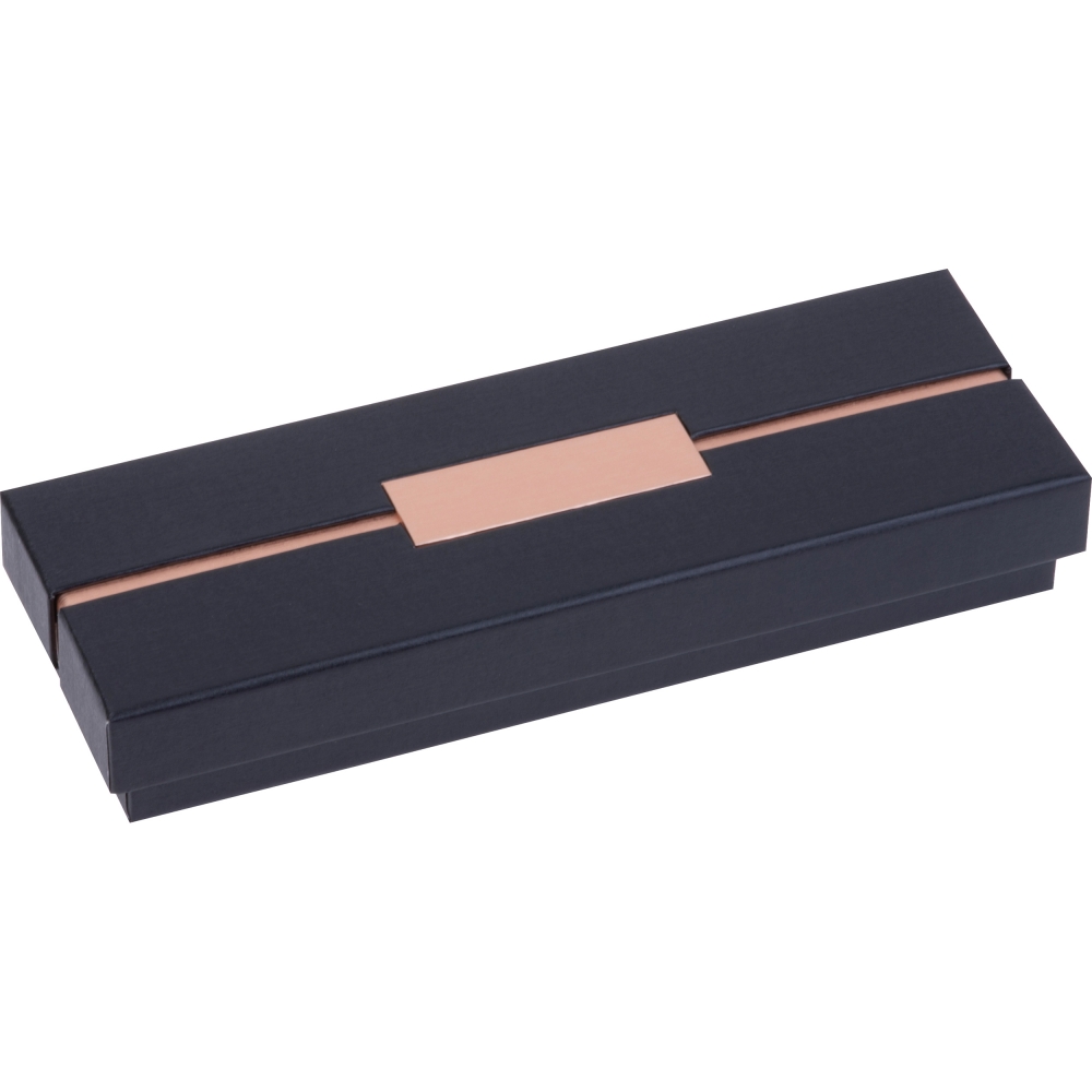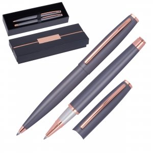Artikel-Nr: MCM1541077CrisMa Metall Schreibset bestehend aus einem Drehkugelschreiber (800m Schreiblänge) und einem Rollerball (500m Schreiblänge) mit roséfarbenen Details. Beide Scheibgeräte sind blauschreibend und in einer schwarzen Kartonbox verpackt. Ihre Werbung gravieren wir neben den Clip auf beide Schreibgeräte.