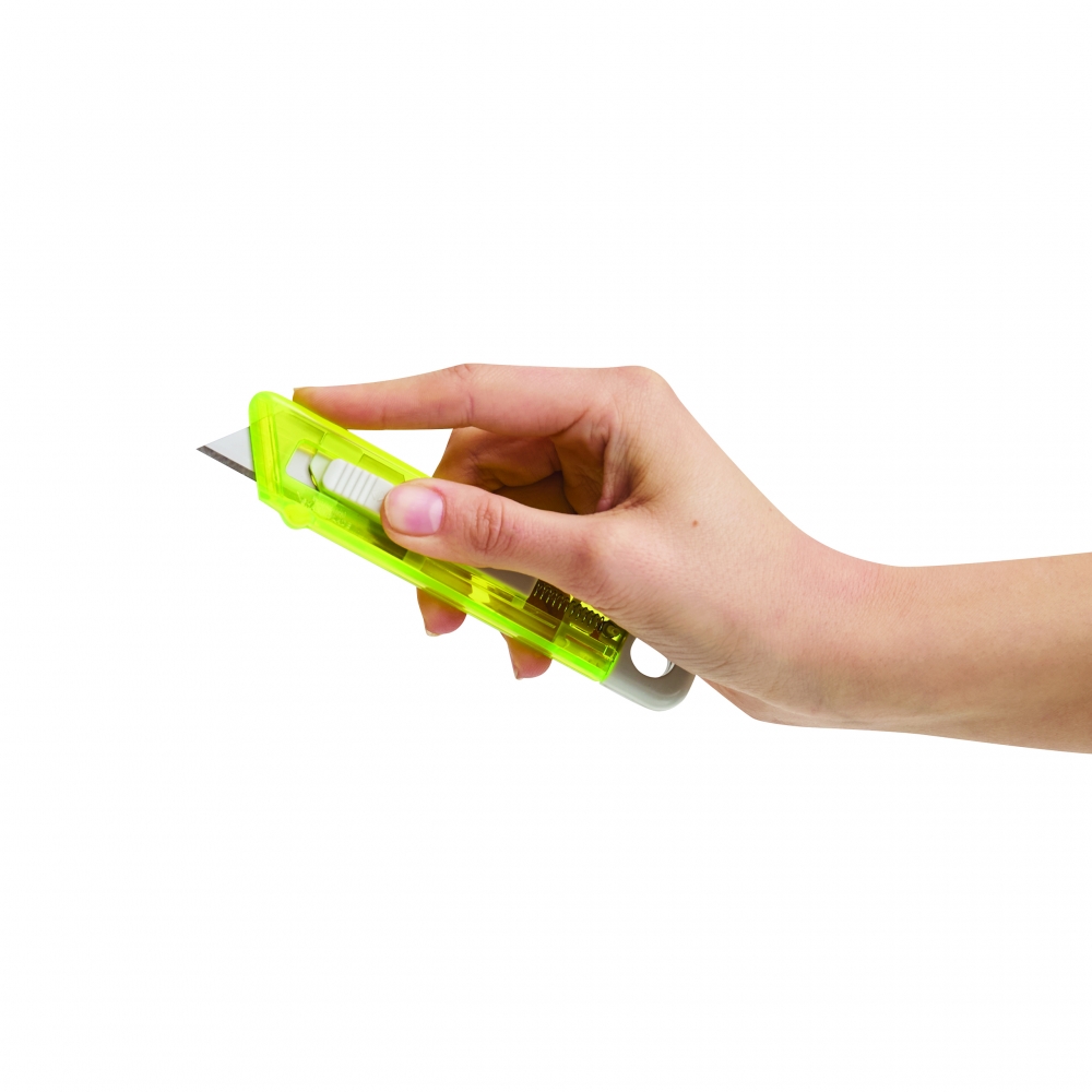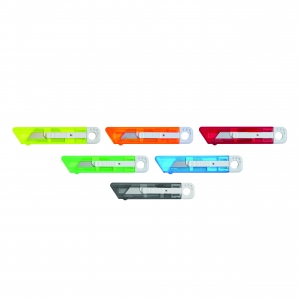 Artikel-Nr: INP56-0399044Cuttermesser SLIDE IT: Schiebemechanismus mit Rückholfeder, auswechselbare Klinge, farbiges Kunststoff-Gehäuse mit Öse zum Aufhängen am Griffende