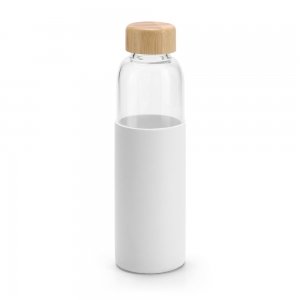 Artikel-Nr: PST94699-106Trinkflasche aus Borosilikatglas mit einem Deckel aus Bambus und einer Silikon-Ummantelung (600 mL). Geliefert in einer Schachtel. Da das Produkt aus natürlichen Materialien hergestellt wird, können Farbe des Produkts sowie das Druckergebnis von Produkt zu Produkt unterschiedlich sein. ø68 x 231 mm