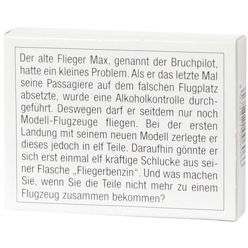 Artikel-Nr: 375109297Flieger Max darf nach einer Alkoholkontrolle nur noch Modellflugzeuge bauen. Bauen Sie für ihn aus zwölf Teilen einen Jumbo-Jet. Denn er hat schon wieder mal zu viel Flugbenzin getankt. Achtung! Nicht geeignet für Kinder unter 36 Monaten.
