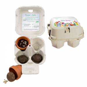 Artikel-Nr: HOP12.41099.00-sonEs grünt und blüht im Büro und vor der Tür – diese Kombination steckt in diesem nachhaltigen Werbegeschenk. Verpackt im Original Eierkarton mit großem, individuellen Werbeaufkleber auf der Außenseite. Der Kunde erhält zwei Ton-Töpfchen mit Eierbaum- bzw. Sonnenblumensamen für den Blumengruß auf Schreibtisch oder Fensterbank. Um Futter für die Bienen und Schmetterlinge auch nach draußen zu bringen, werden zusätzlich zwei Flower-Balls - kleine Kugeln, bestehend aus Samen, Erde und Tonpulver - geliefert. Diese werden beliebig und direkt auf dem Boden verteilt und motivieren den Beschenkten im Stile von Guerilla-Gardening aktiv zu werden.