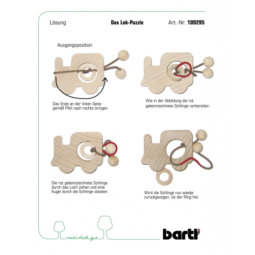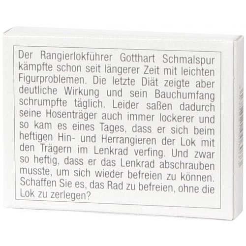 Der Lokführer Gottthart Schmalspur hat sich mit seinen Hosenträgern im Lenkrad verfangen. Befreien Sie den Tollpatsch. Lösen Sie den Ring von der Lok! Achtung! Nicht geeignet für Kinder unter 36 Monaten.