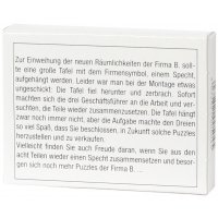 Artikel-Nr: 375102754Die Tafel der Firma B. ist kaputt. Flugs versuchen die Gebrüder B. den darauf abgebildeten Specht wieder zusammenzupuzzeln. Helfen Sie ihnen dabei! Acht Teile. Achtung! Nicht geeignet für Kinder unter 36 Monaten.