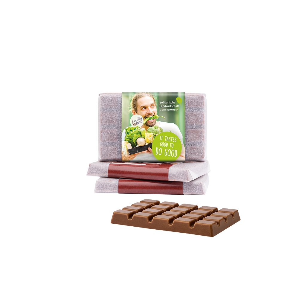 Artikel-Nr: PUC1054.00002Design Schokolade mit Fairtrade Siegel im Pergaminpapier mit weißer Papierbanderole, individuell bedruckt. Inhalt: 1 Täfelchen Alpenvollmilchschokolade, eingewickelt in Pergaminpapier (kann über die Papiertonne entsorgt werden), 10 g. Saisonartikel - solange der Vorrat reicht!