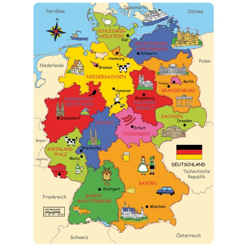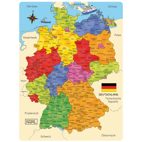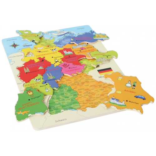 Artikel-Nr: 375101818Die hochwertige Landkarte aus Holz ist ein lehrreiches Puzzle. Jedes Puzzleteil entspricht einem deutschen Bundesland und zeigt dessen Hauptstadt. Auf dem Puzzlebrett darunter findet man die zugehörigen Landkreise. Mit dem Material lernt das Kind visuell und taktil Deutschland kennen. Beim Puzzeln ermittelt man die Größe und Lage der Bundesländer, kann deren Hauptstädte zuordnen und sie vergleichen. Dabei prägt man sich die Namen der Bundesländer, ihrer jeweiligen Hauptstadt und Landkreise ein. Ab 5 Jahren. Selbstkontrolle durch das Material. Größe: 40 x 30 x 10 cm. Achtung! Nicht geeignet für Kinder unter 36 Monaten.