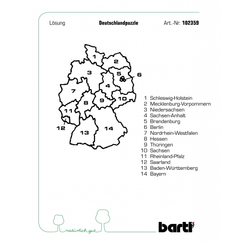 13 Teile. Sehr lehrreich: Jedes Puzzle-Teil stellt ein Bundesland dar! Achtung! Nicht geeignet für Kinder unter 36 Monaten.