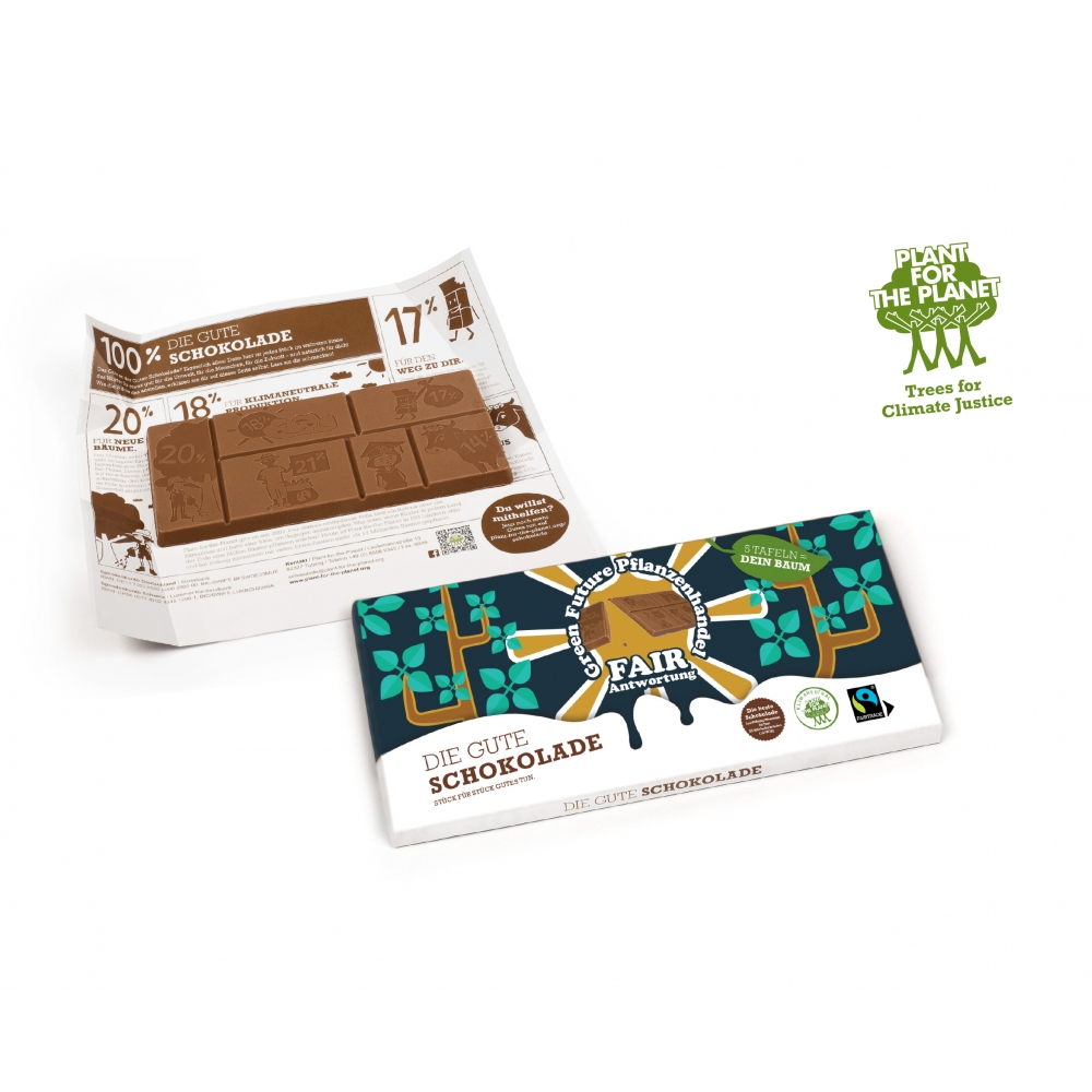 Artikel-Nr: MGN07043-0001Die Gute Schokolade von Plant-for-the-Planet macht Naschen nachhaltig: Für je fünf verkaufte Tafeln wird ein Baum gepflanzt. Feinste Schweizer Vollmilchschokolade, verpackt mit individuellem Wickler. Auf Wunsch erhältlich mit digitaler Baumspendenurkunde – ein Werbegeschenk mit doppeltem Mehrwert.