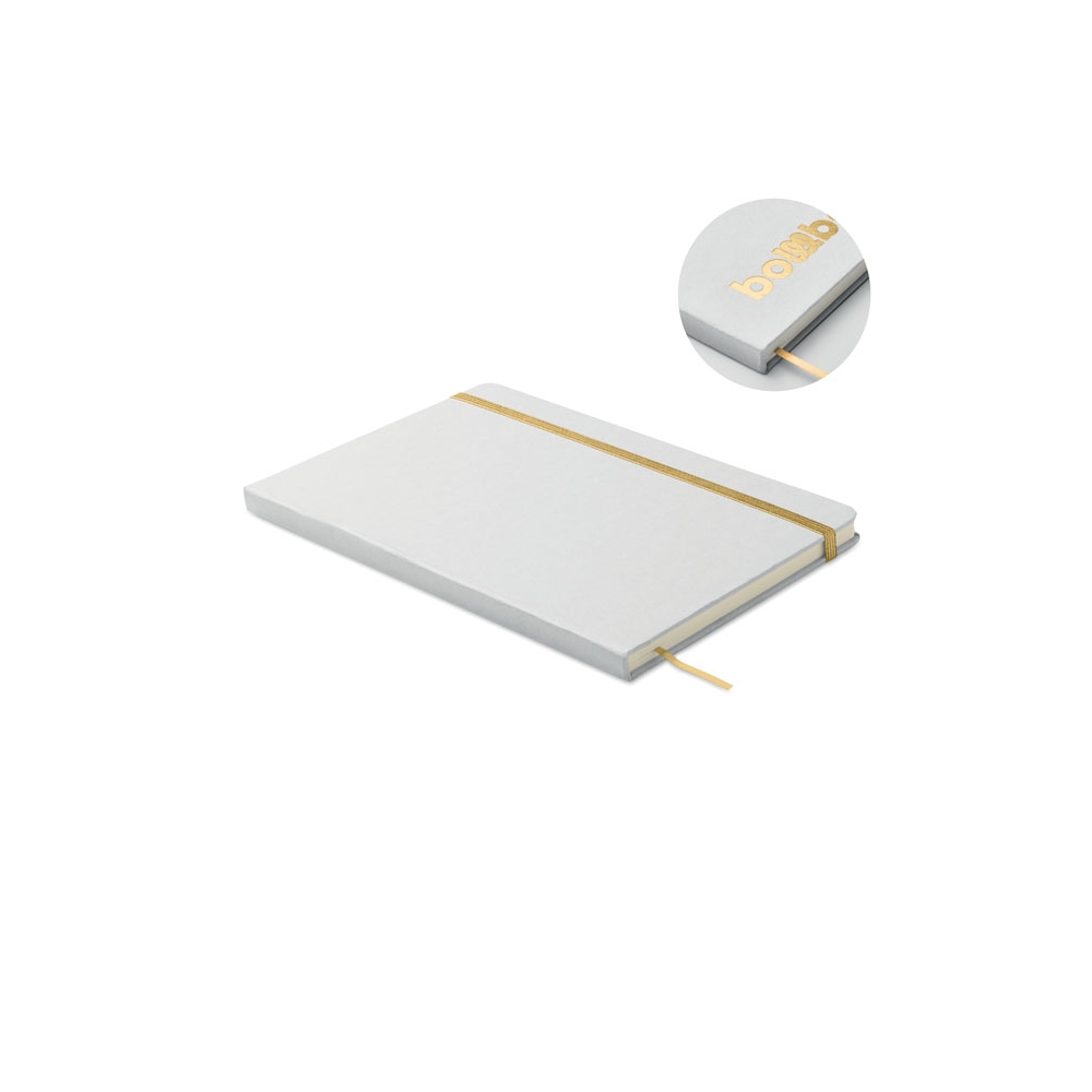 Artikel-Nr: OCBMO2578-98DIN A5 Notizbuch mit gebundenem Hard Cover aus 70% recyceltem Milchkarton und 30% recyceltem Papier. Weißes Cover. 80 Blatt (160 Seiten) liniertes Recyclingpapier. Nach der Gravur des Covers, wird die Farbe sichtbar. Farblich abgestimmtes elastisches Verschlussband und Lesebändchen.