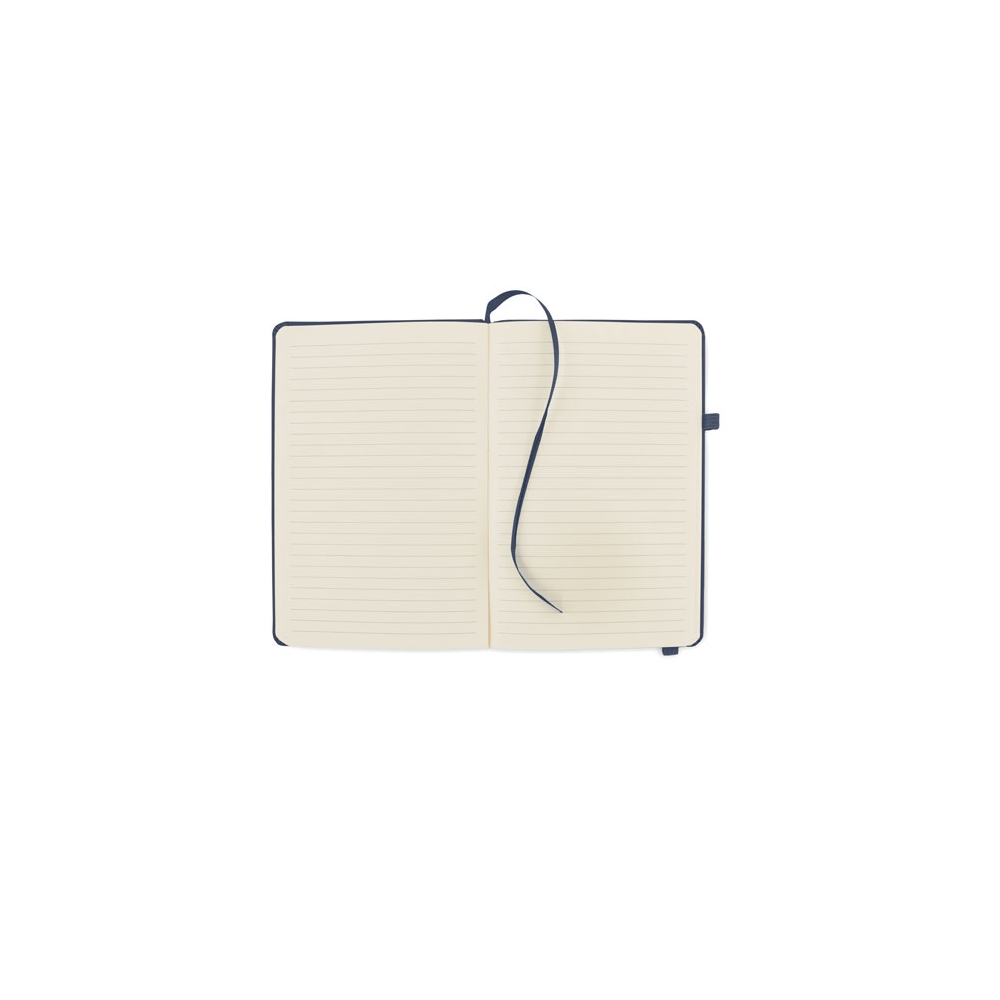 Artikel-Nr: OCBMO6835-85DIN A5 Notizbuch mit Hardcover aus 70% recyceltem Pre-Consumer-Leder und 30% PU-Latex. 96 Blatt (192 Seiten) liniertes Recyclingpapier. Mit farblich passendem elastischen Baumwoll Verschlussband und Stiftschlaufe.