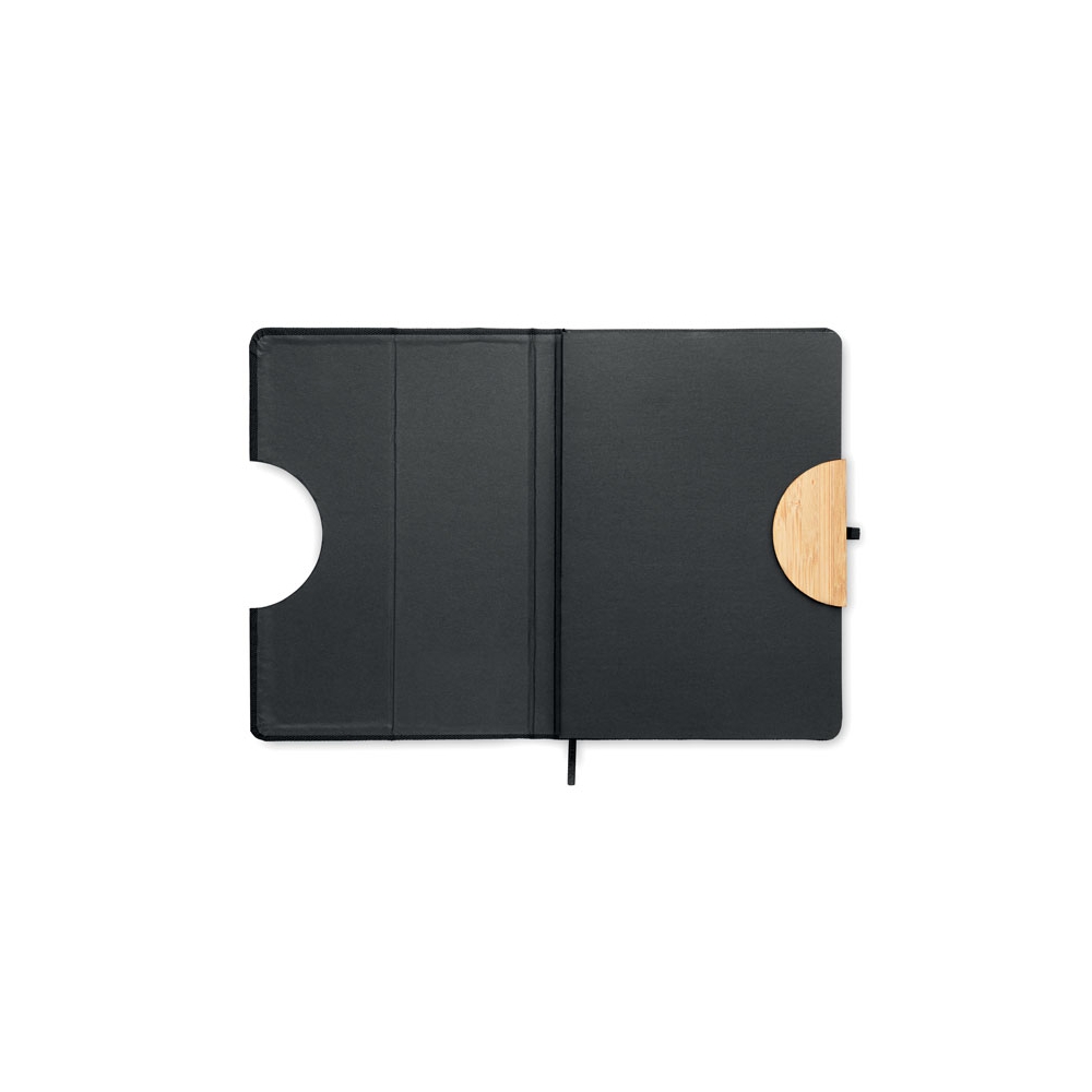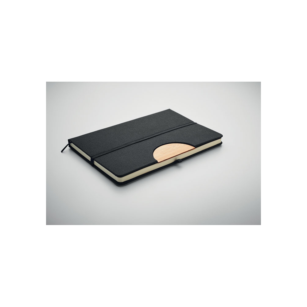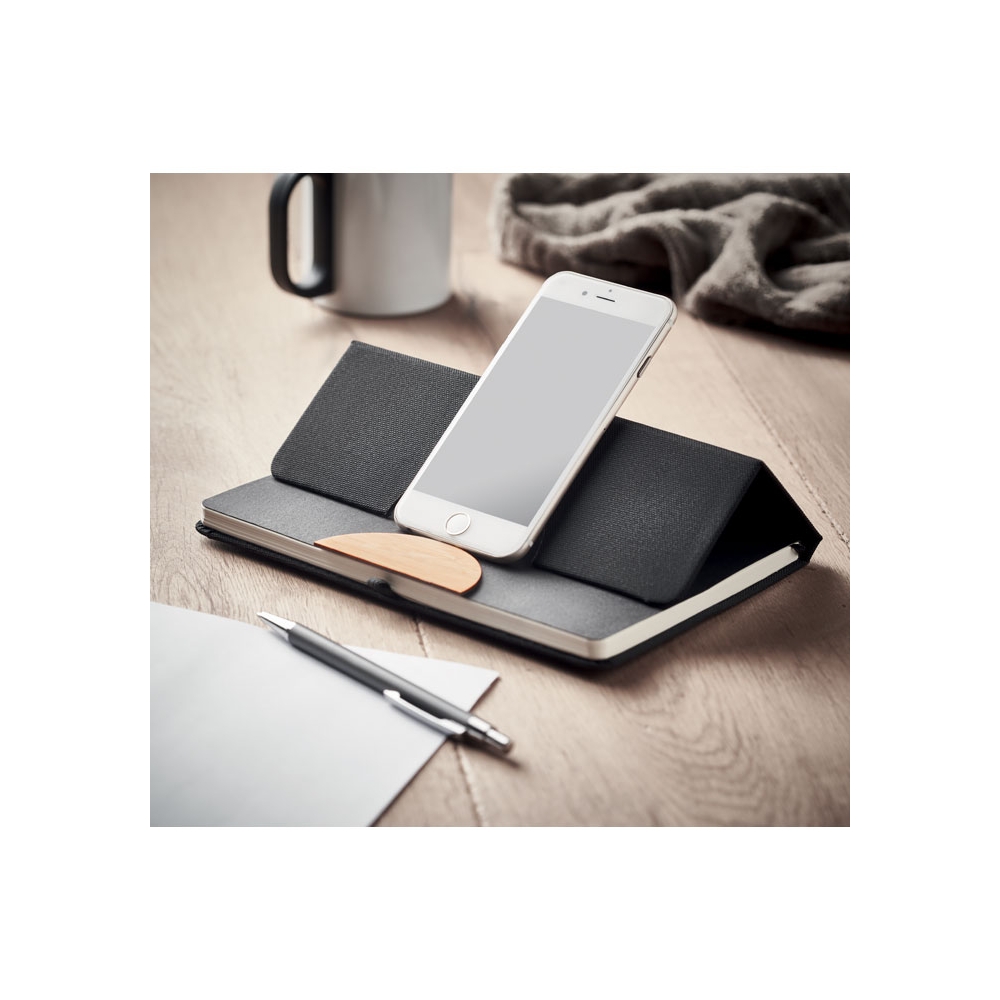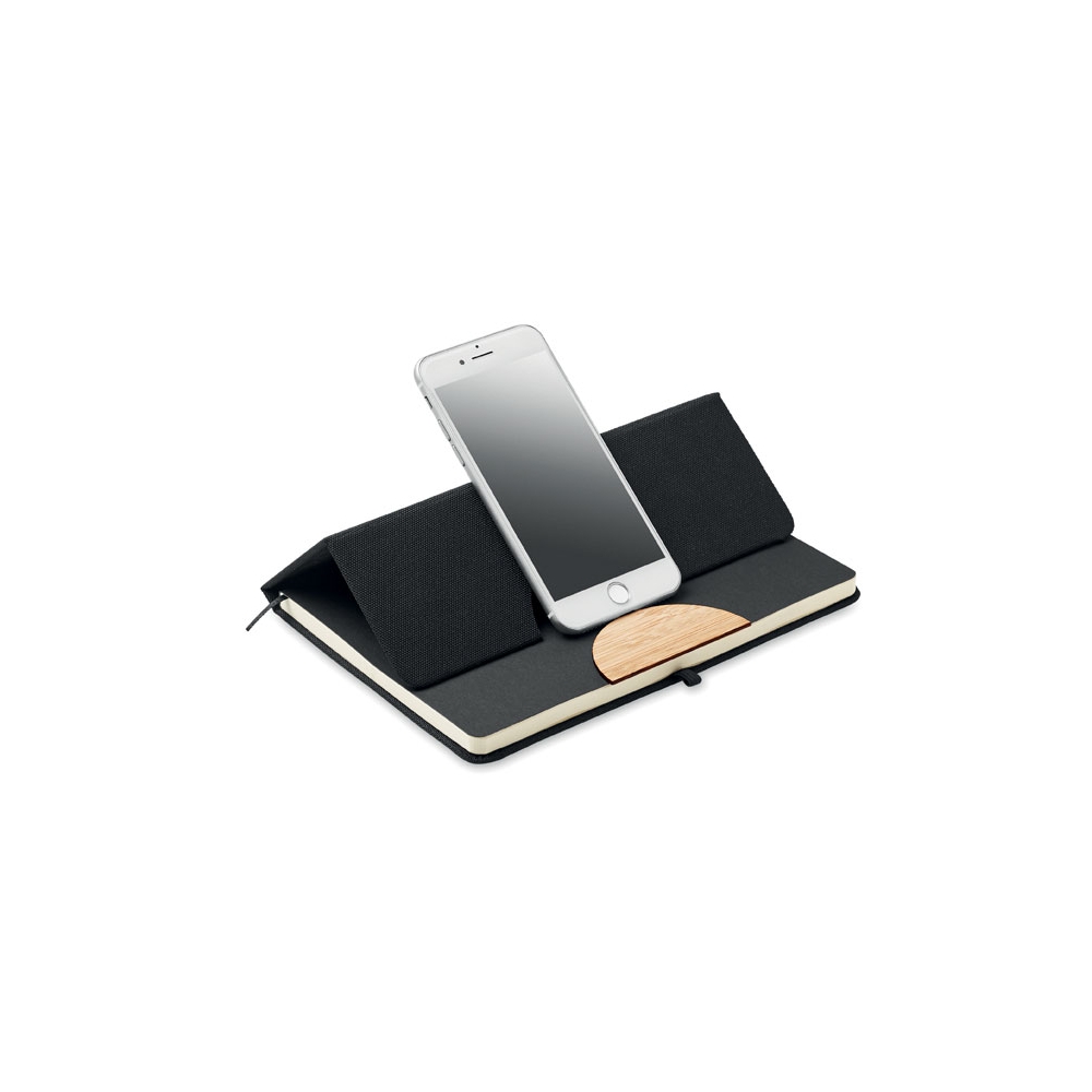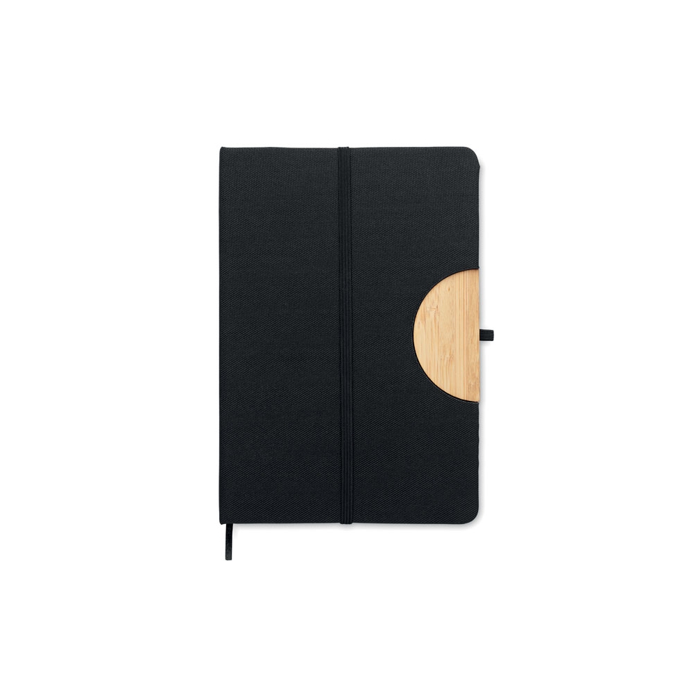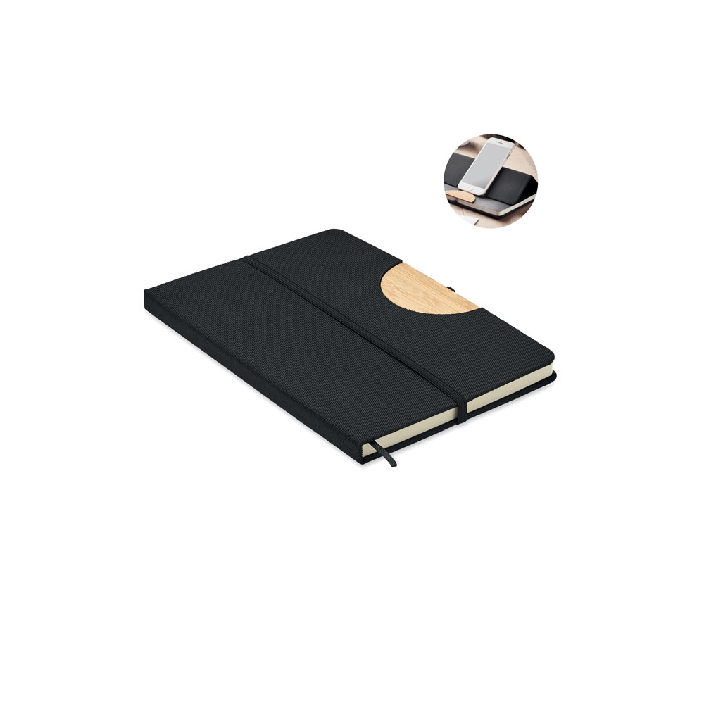 Artikel-Nr: OCBMO6576-03DIN A5 Notizbuch mit Hard Cover aus 600D RPET mit Details aus Bambus sowie Smartphone-Halterung. 80 Blatt (160 Seiten) liniertes 70 g / m² Recyclingpapier. Elastisches Verschlussband, Lesebändchen und Stiftschlaufe. Nehmen Sie dieses unentbehrliche Büroutensil mit zu Ihrem nächsten Meeting. Haben Sie eine online-Besprechung? Klappen Sie den Smartphone-Halter auf und stellen Sie Ihr Gerät hinein. FSC®-certified | FSC MIX CREDIT, P7.1, FSC-C213206