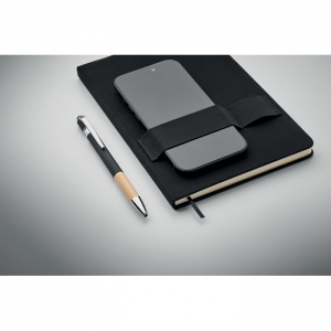 Artikel-Nr: OCBMO2469-03DIN A5 Notizbuch mit gebundenem Hard Cover aus 600D RPET. 80 Blatt (160 Seiten) liniertes Recyclingpapier. Stiftschlaufe, Smartphone-Schlaufe auf Frontseite, Lesebändchen. Druckkugelschreiber aus Aluminium / Bambus. Rückseitige Dokumententasche. Blaue Tinte. FSC®-certified | FSC MIX CREDIT, P7.1 , FSC-C213206
