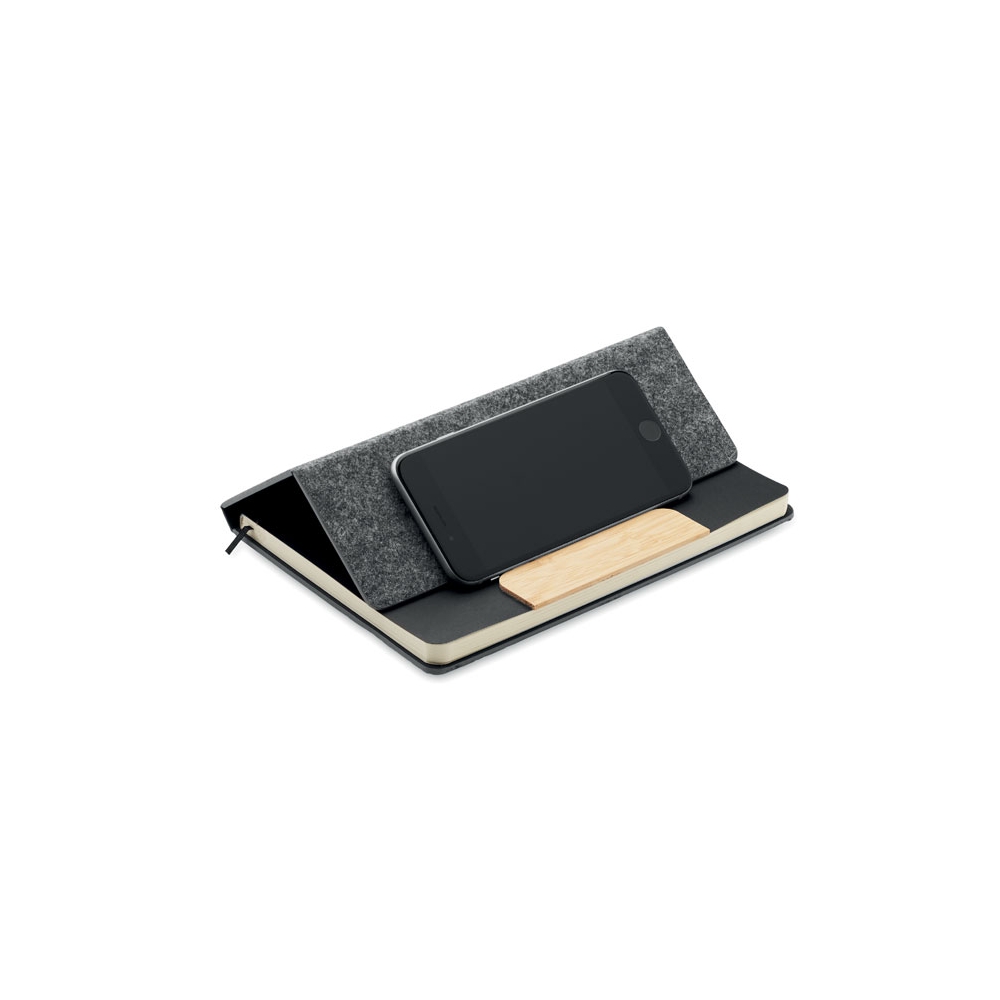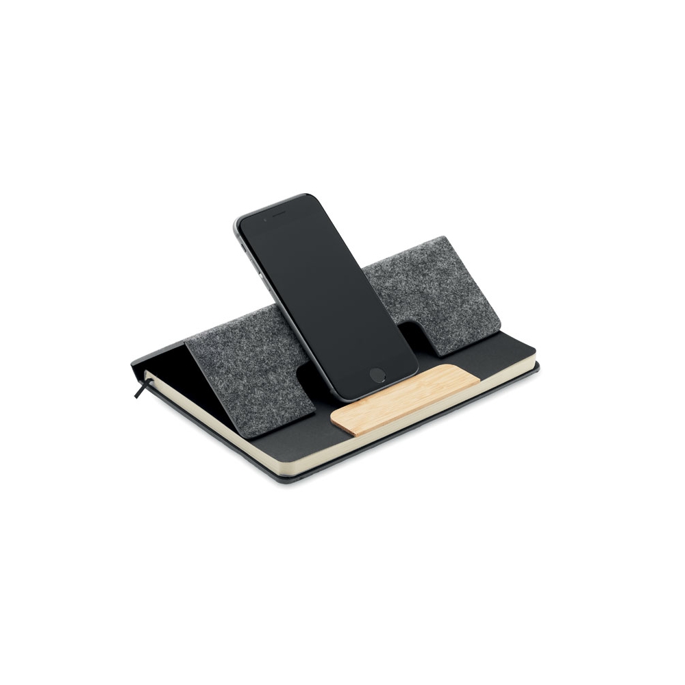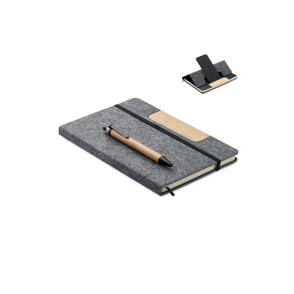 Artikel-Nr: OCBMO2390-15DIN A5 Notizbuch mit gebundenem Hard Cover aus RPET-Filz mit Smartphone-Halterung. 80 Blatt (160 Seiten) liniertes Recyclingpapier. Elastisches Verschlussband und Lesebändchen. Inkl. Druckkugelschreiber mit Schaft aus Bambus. Blaue Tinte.