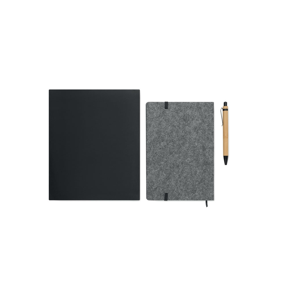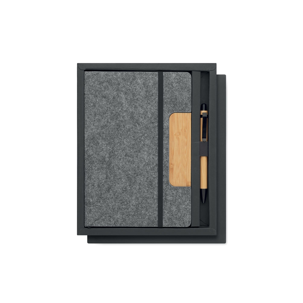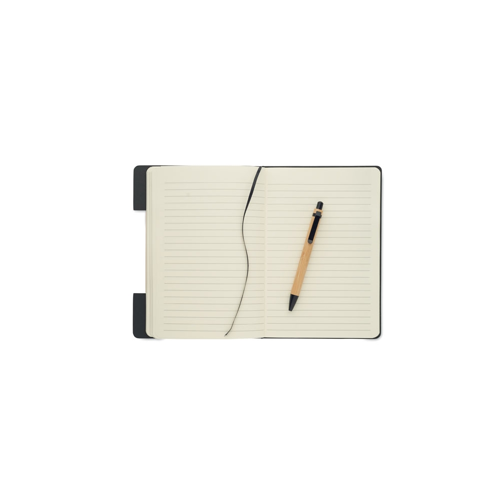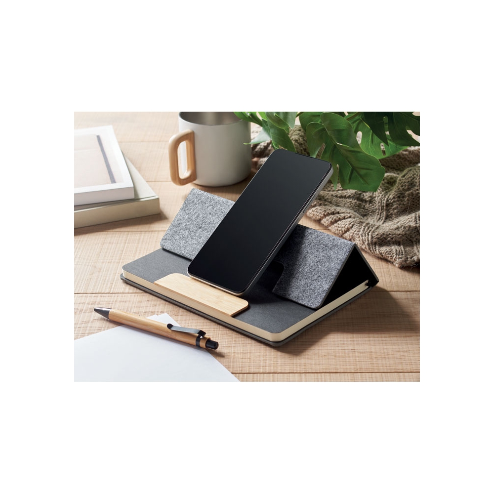 Artikel-Nr: OCBMO2390-15DIN A5 Notizbuch mit gebundenem Hard Cover aus RPET-Filz mit Smartphone-Halterung. 80 Blatt (160 Seiten) liniertes Recyclingpapier. Elastisches Verschlussband und Lesebändchen. Inkl. Druckkugelschreiber mit Schaft aus Bambus. Blaue Tinte.