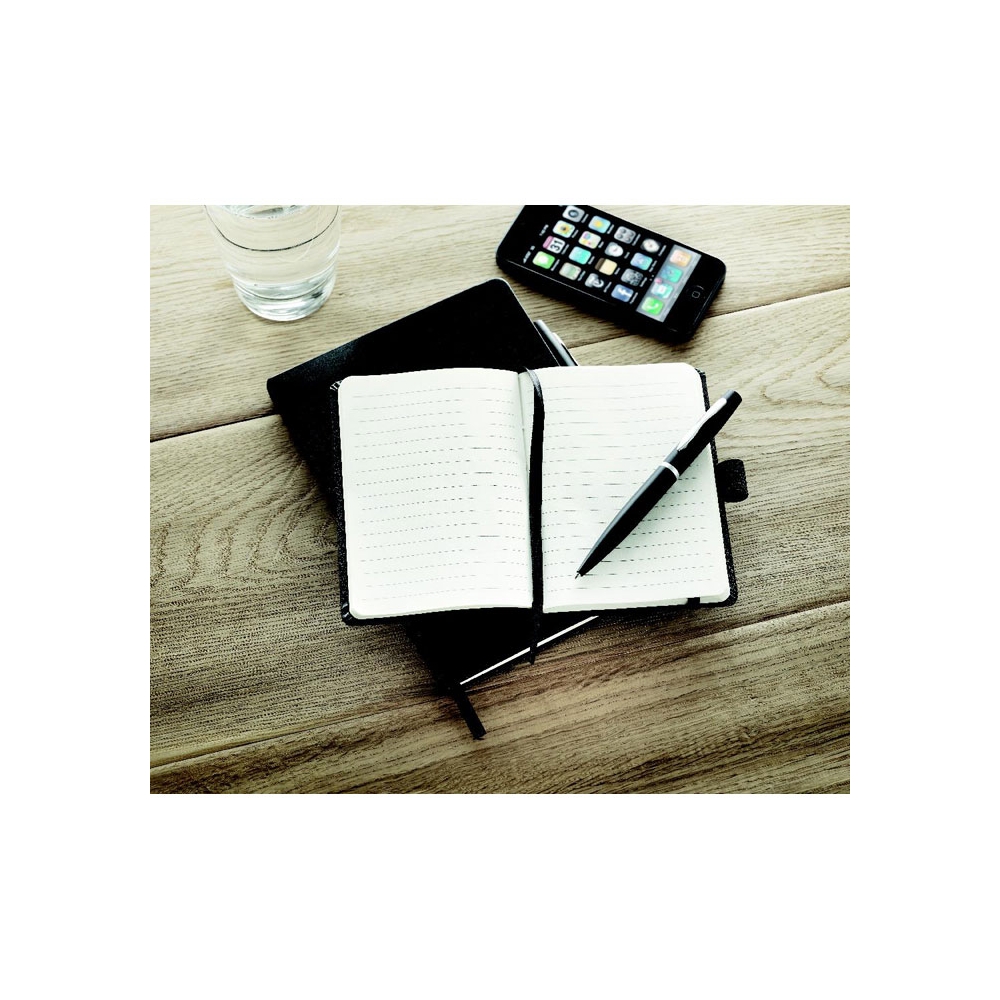 Artikel-Nr: OCBMO8109-03DIN A6 Notizbuch mit Hard Cover aus PU und 72 Blatt (144 Seiten) liniertem Papier. Elastisches Verschlussband und Lesebändchen. Mit passendem Druckkugelschreiber aus Metall. Blaue Tinte. FSC MIX CREDIT | P7.1 | FSC-C213206