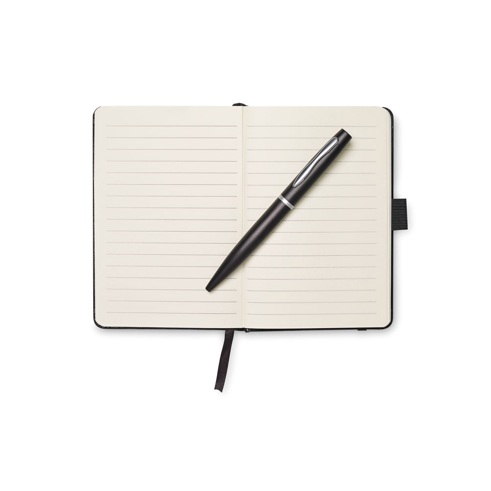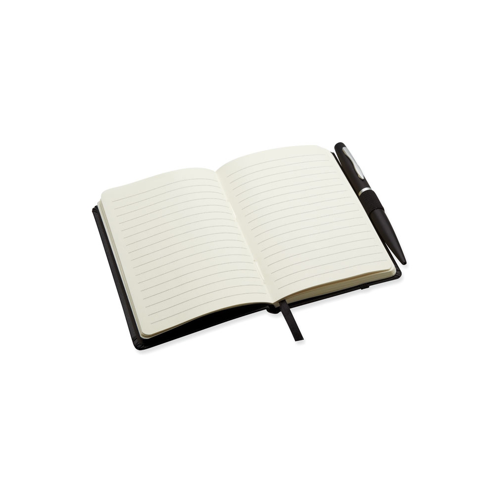 Artikel-Nr: OCBMO8109-03DIN A6 Notizbuch mit Hard Cover aus PU und 72 Blatt (144 Seiten) liniertem Papier. Elastisches Verschlussband und Lesebändchen. Mit passendem Druckkugelschreiber aus Metall. Blaue Tinte. FSC MIX CREDIT | P7.1 | FSC-C213206