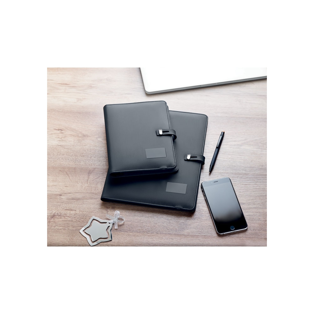 DIN A4 Portfolio mit Cover aus PU in Leinen-Optik. Magnetverschluss. Block mit 20 Blatt (40 Seiten) liniertem Papier. Inkl. 4000 mAh Powerbank und Mikro-USB-Kabel / Typ C. Smartphone- / Tablet Halterung. Kreditkarten Steckfächer. Stiftschlaufe. Mit schwarzer Aluminium Plakette für Ihr Logo.