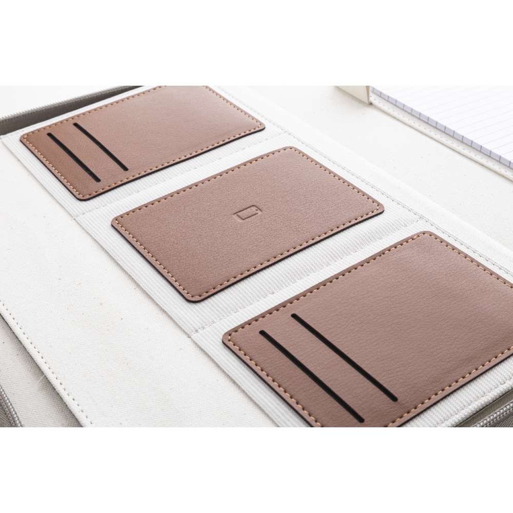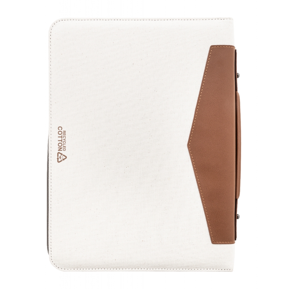 Artikel-Nr: AND808296-00Dokumentenmappe im A4-Format aus recyceltem Canvas und recyceltem Kunstleder, mit Reißverschluss und Tragegriff. Ausgestattet mit mehreren Organizerfächern im Inneren und einem Notizblock mit 20 linierten Seiten aus recyceltem Papier. Material: 70 % recycelte Baumwolle und 30 % RPET-Polyester.
