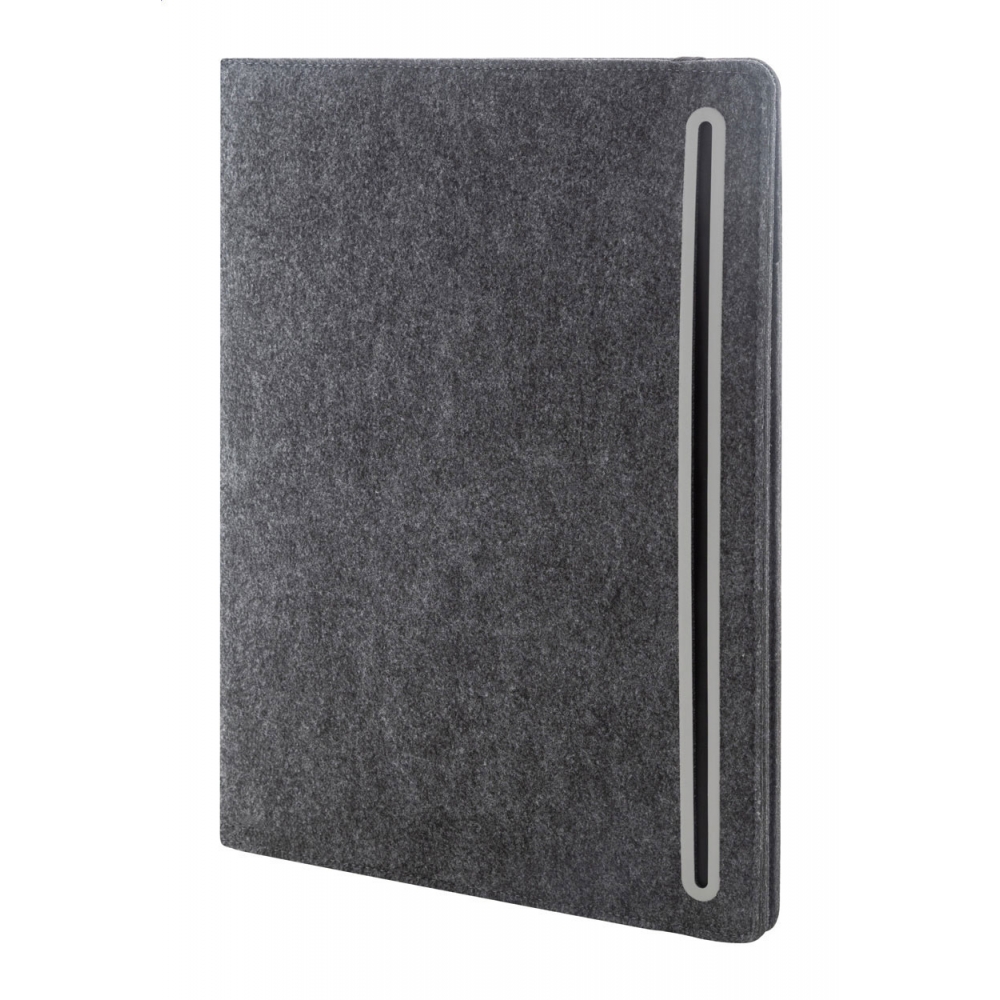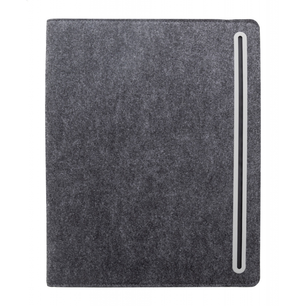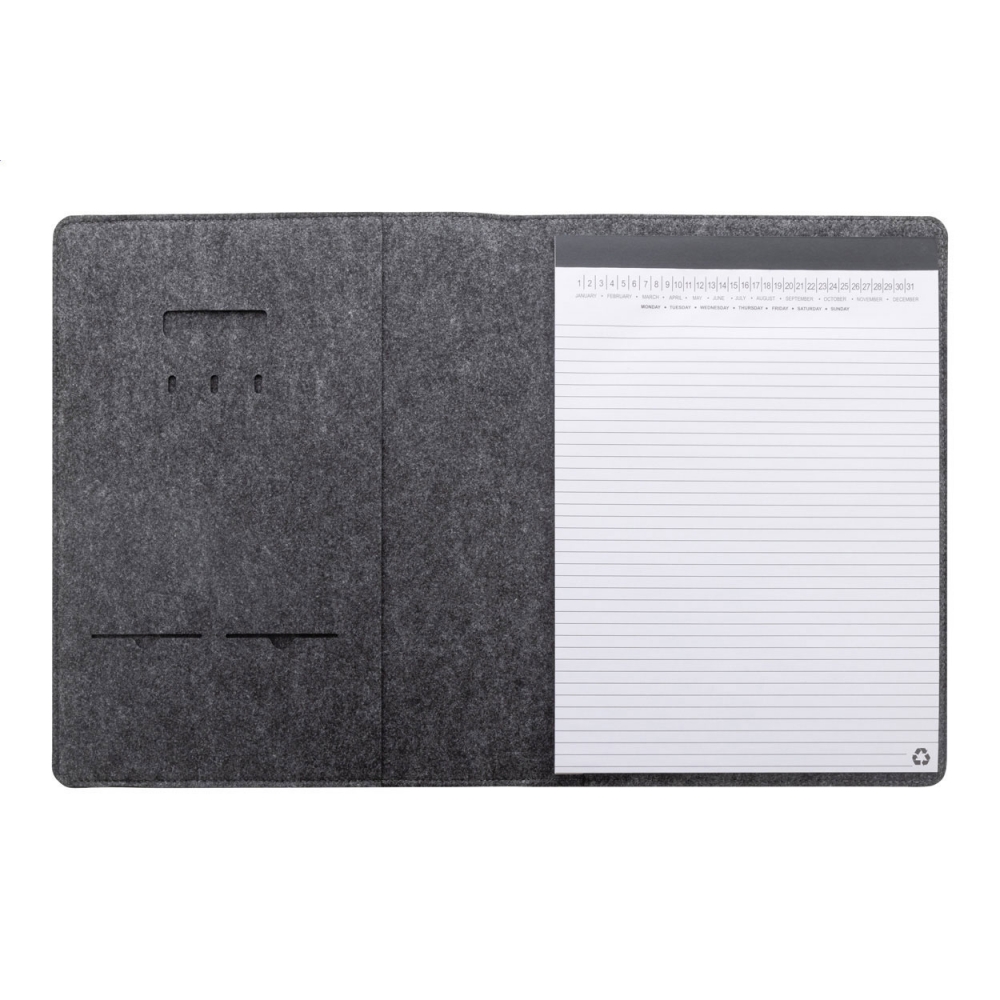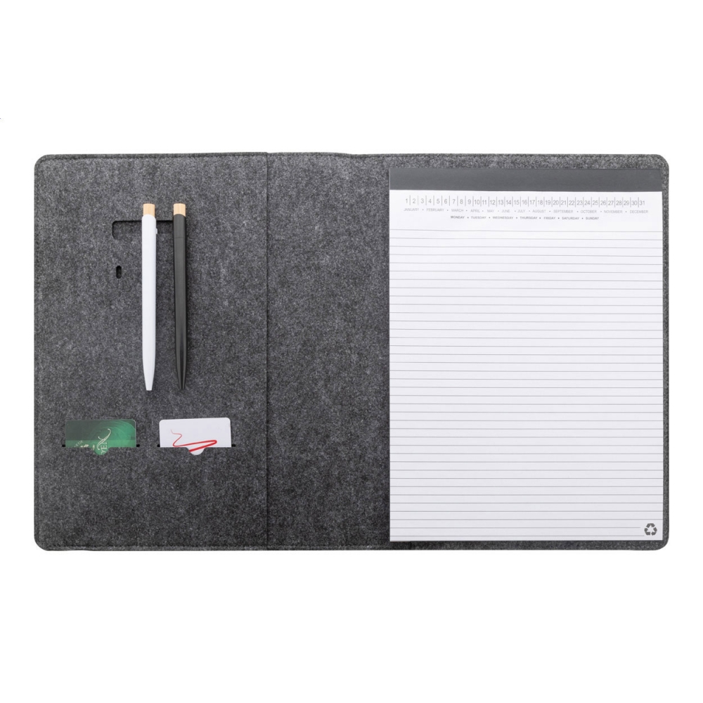 Artikel-Nr: AND808272-80Dokumentenmappe im A4-Format aus RPET-Filz mit einer Fronttasche und mehreren Organizerfächern innen. Enthält einen Notizblock mit 20 linierten Seiten aus recyceltem Papier.