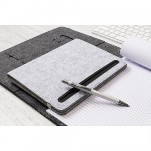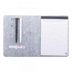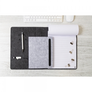 Artikel-Nr: AND808273-77Dokumentenmappe im A5-Format aus RPET-Filz mit einer Fronttasche und mehreren Organizerfächern innen. Enthält einen Notizblock mit 20 linierten Seiten aus recyceltem Papier.
