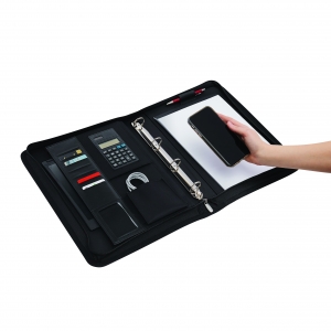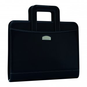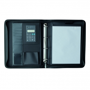 Artikel-Nr: INP56-1103179Dokumentenmappe NOBLESSE RING im DIN-A4-Format: umlaufender Reißverschluss zum Verschließen, innen diverse Einsteckfächer, 1 Klarsichtfach, 4-Ring-Mechanik, inkl. Schreibblock (blanko), Schlaufe für 1 Schreibgerät, Taschenrechner, außen versenkbare Tragegriffe, dekorative Ziernähte, in Leder-Optik mit Metallplättchen für Ihre Werbeanbringung