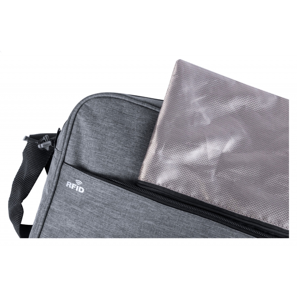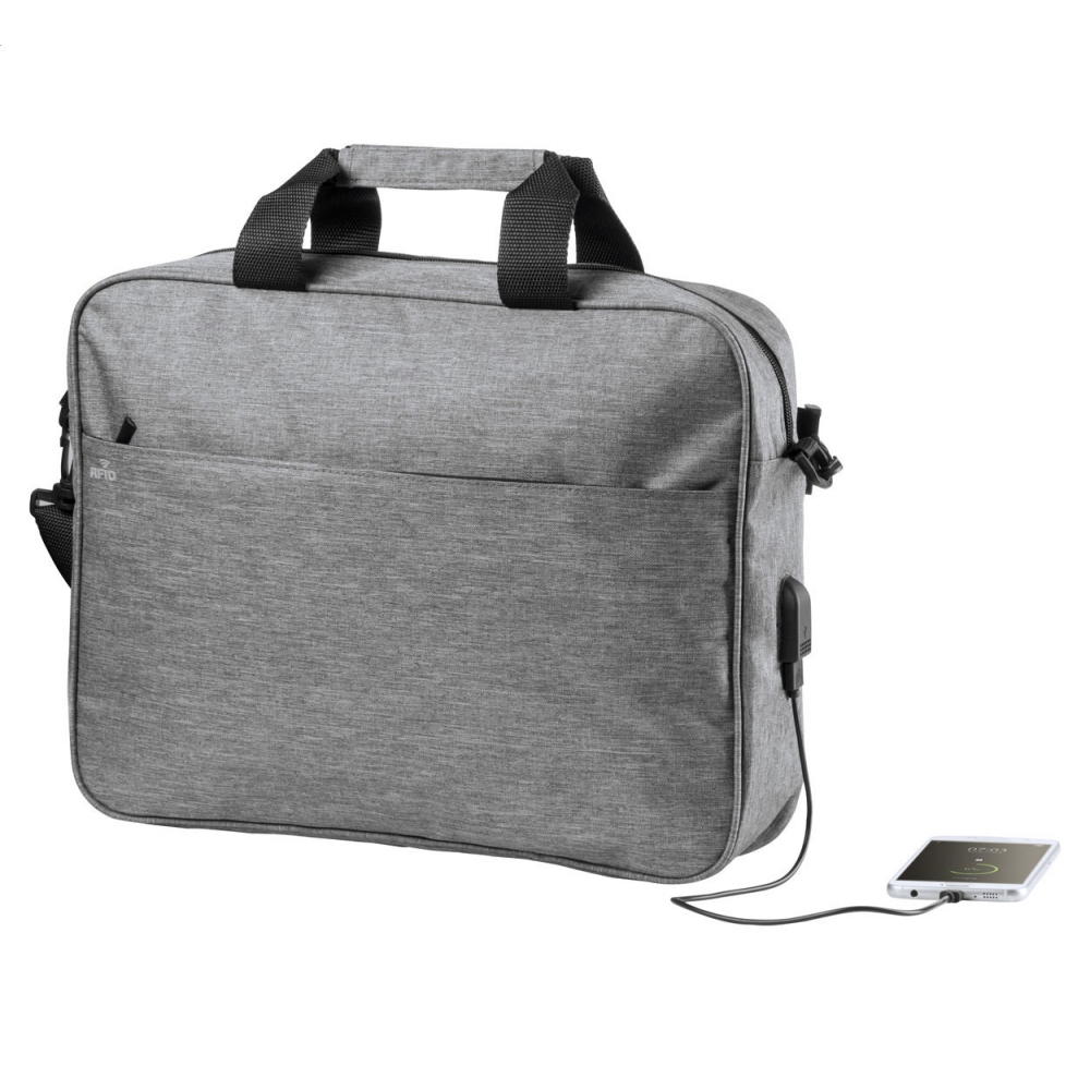 Artikel-Nr: AND721154-77Dokumententasche mit RFID-Ausleseschutz, gepolstertem Laptop- und Tabletfach (15" & 10"), gepolstertem Schultergurt und eingebautem USB-Anschluss für Powerbanks. Material: 300D Polyester.
