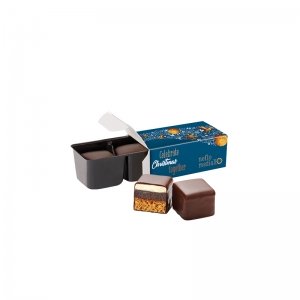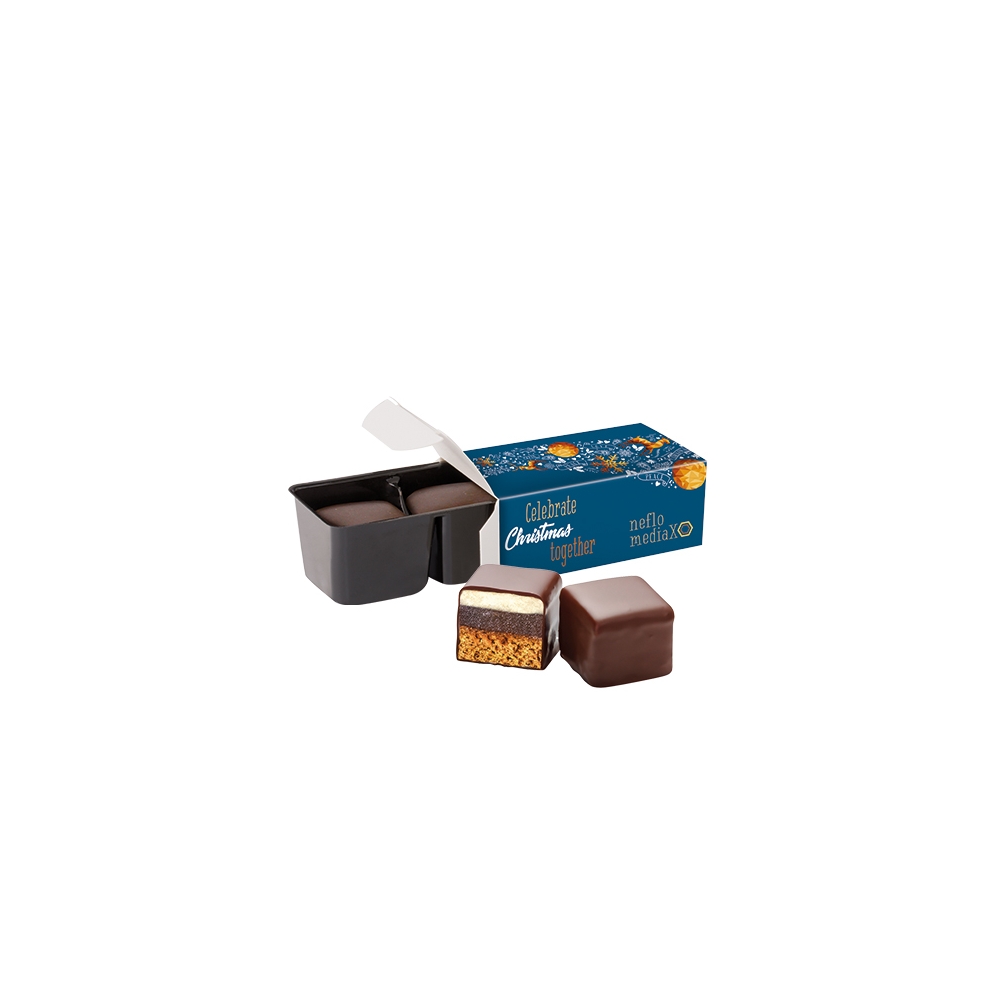 Artikel-Nr: PUC1106.00001Lambertz Dominosteine im 2er Blister in Werbebox aus weißem Karton, individuell bedruckt. Inhalt: 2 Lambertz Dominosteine (dreischichtig) bezogen mit edler Zartbitterschokolade, 25 g. Saisonartikel - solange der Vorrat reicht!