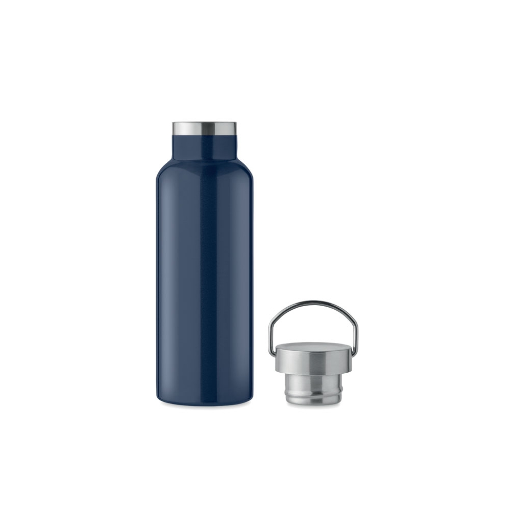 Artikel-Nr: OCBMO2107-85Doppelwandige Isolierflasche aus recyceltem Edelstahl (90 % recycelter Edelstahl und 10 % Edelstahl). Verschluss mit Henkel. Füllmenge: 500 ml.